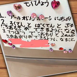 目標! Kids 2015.01.03 冷蔵庫に貼ってあるホワイトボード。 娘の落書きスペースに。 知らぬ間に目標を書いてたけど….(ーー;) 側転はまだいい。 バク転と逆立ち歩きって… 何を目指してるのか?
