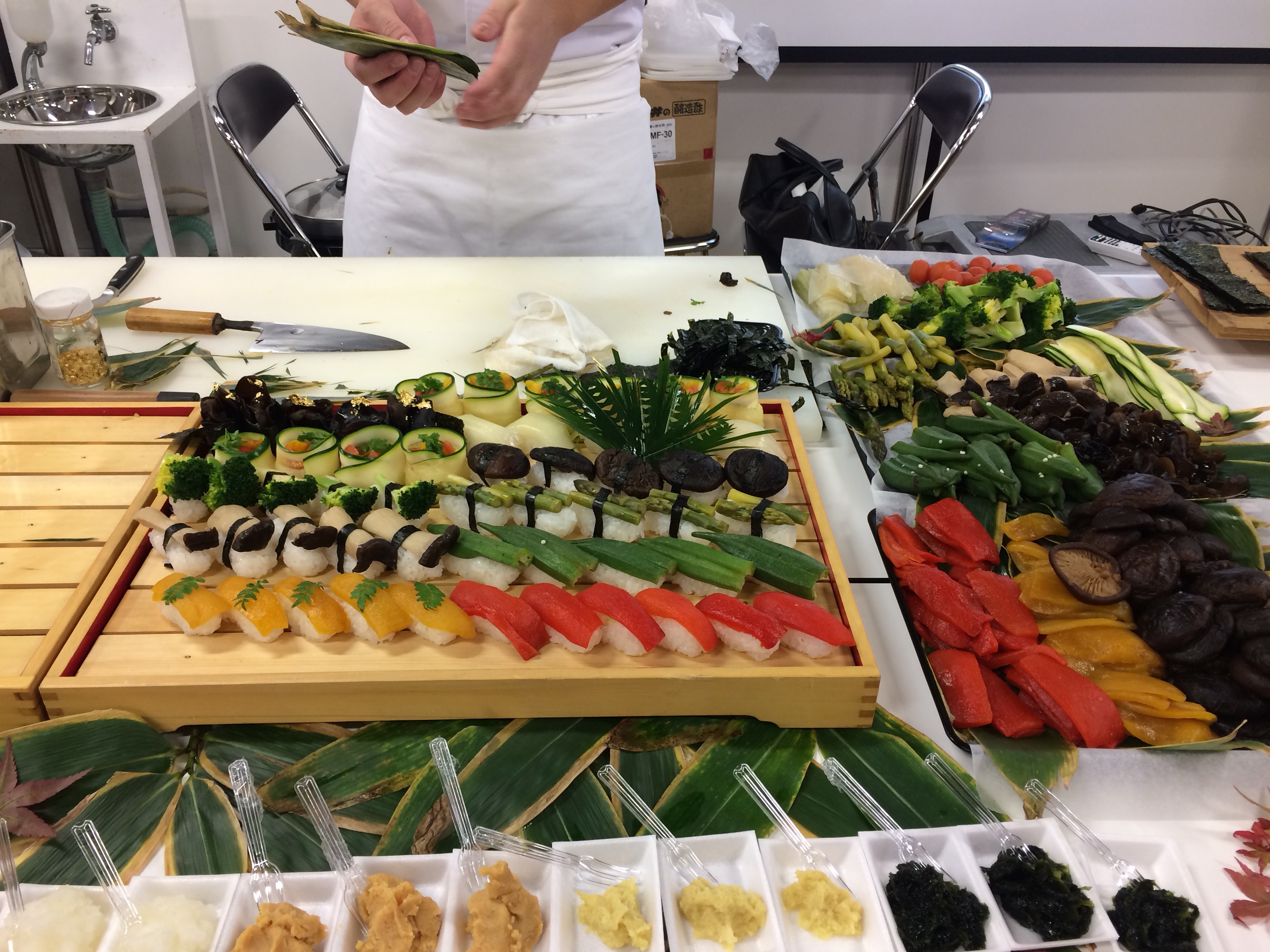写真はまさむねさんの野菜寿司。見た目は綺麗だし、美味しいし大人気!味見もさせて頂きました。